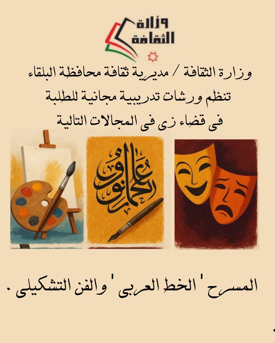 بدعم من وزارة الثقافة/ تنوي مديرية ثقافة البلقاء عقد ورش تدريب مجانية في قضاء زي في الحقول التالية:#الفنون_التشكيلية_الرسم#الخط_العربي .#المسرح...