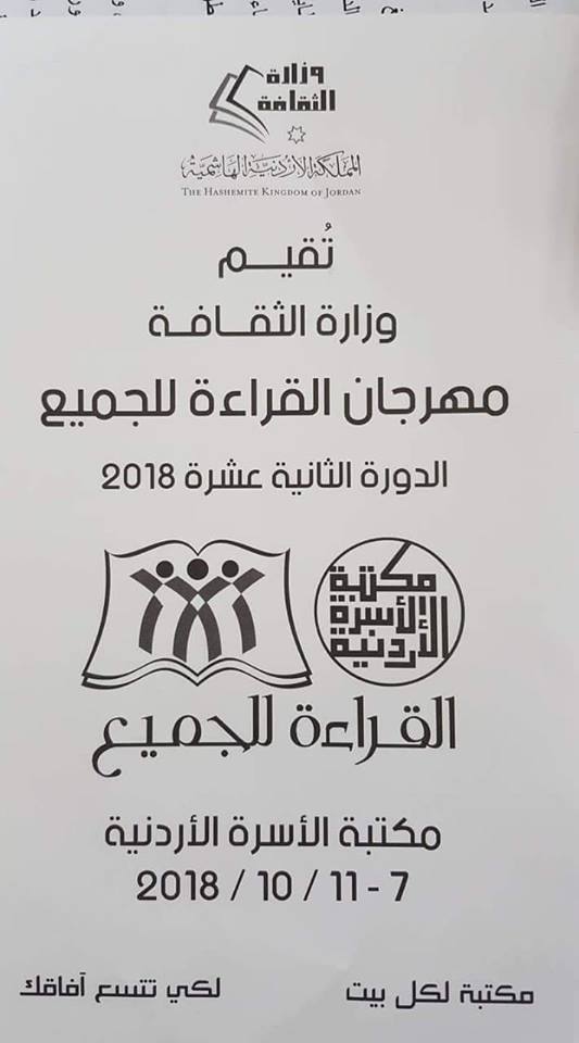 بدعوتكم لحضور الدورة الثانية عشرة من مهرجان القراءة للجميع 2018 المنبثق عن برنامج مكتبة الاسرة الاردنية وذلك خلال الفترة بين 7 - 11 /10 / 2018 في المراكز التالية :