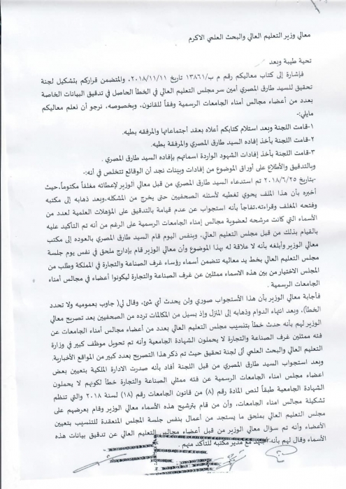 اللجنة في ردها ، قالت لا احد يتحمل مسؤولية عدم تدقيق المؤهلات العلمية لعدد ممن رشحهم وزير التعليم العالي لعضوية مجالس امناء بعض الجامعات ؟؟حيث تشير مضامين التحقيق إلى أن وزير التعليم العالي الأسبق أضاف أسماء عدد من الشخصيات من بينها الأسماء التي أثارت الجدل بخط يده على جدول اعمال مجلس التعليم العالي.