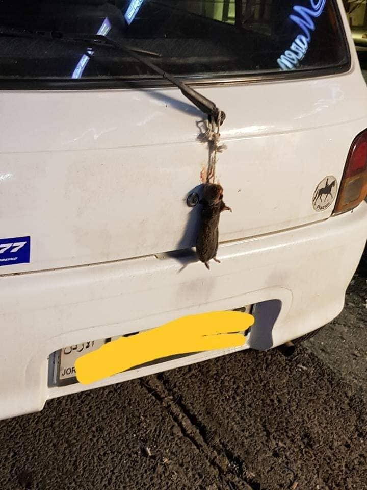 . تداول أردنيون صورة لمواطن أردني كان قد شنق فأراً من خلال ربط حبل بعنقه وتعليقه بمركبته من الخلف والسير به في الشوارع، انتقاماً منه بعد ان وجده داخل المركبة.