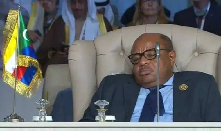 . تداول الكثيرون من رواد مواقع التواصل الاجتماعي صورة لمحمد الأمين وزير خارجية جزر القمر ينام خلال القمة العربية في دورتها الثلاثين في العاصمة التونسية.