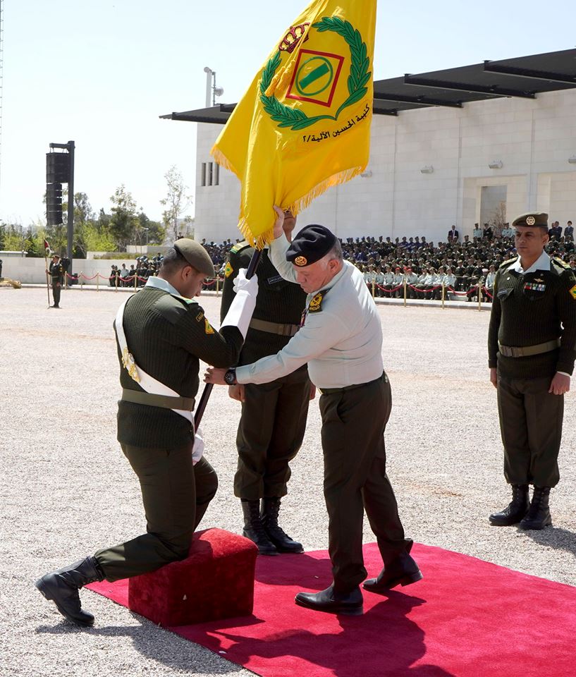 سلم جلالة الملك عبدالله الثاني، القائد الأعلى للقوات المسلحة، بحضور سمو الأمير الحسين بن عبدالله الثاني، ولي العهد، علم جلالة القائد الأعلى إلى كتيبة الحسين الآلية /2 (أم الشهداء)