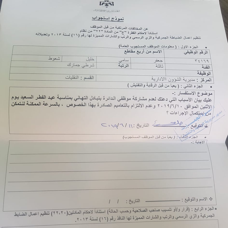 حيث قامت مديرية الرقابة والتفتيش في دائرة الجمارك العامة بتوجيه استجواب الى الموظف جعفر سامي شعوط تضمن قيامه ببيان الاسباب التي دعته لعدم مشاركة موظفي الدائرة بتبادل التهاني بمناسبة عيد الفطر يوم الاثنين الموافق ١٠/ ٦/ ٢٠١٩.