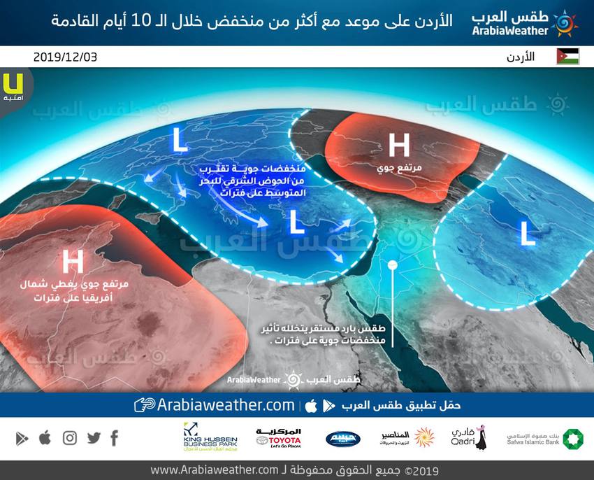 :تشير نواتج التحليلات و بيانات المُحاكاة الحاسوبية للتنبؤات الجوية إلى أن الأردن و سائر دول شرق البحر الأبيض المُتوسط على موعد مع تأثير لأكثر من مُنخفض جوي خلال الـ 10 أيام القادمة، مما يجعل هذه الفترة فترة مُبشرة لتحسين الواقع المطري الذي يُعاني من ضعف كبير في أنطلاقة الموسم المطري سيما في الأردن و فلسطين.