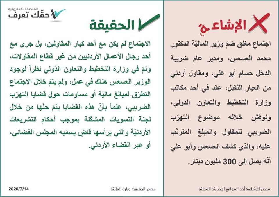 - نفت الحكومة عبر منصة حقك تعرف صجة معلومات تحدّثت عن وجود مساومات بين وزير الماليّة وأحد كبار المقاولين حول إحدى قضايا التهرّب الضريبي.