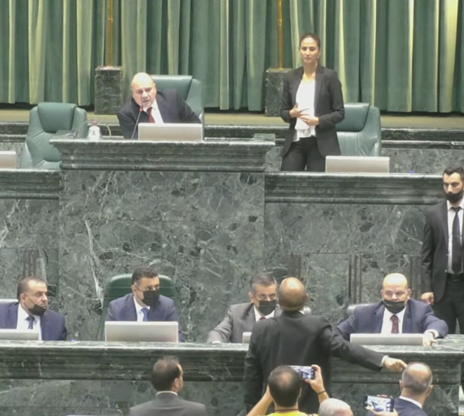 ونصح وزير الدولة لشؤون رئاسة الوزراء إبراهيم الجازي، الخصاونة بالانسحاب من الجلسة ليرد الخصاونة: "لا تنسحب ولا على بالك".