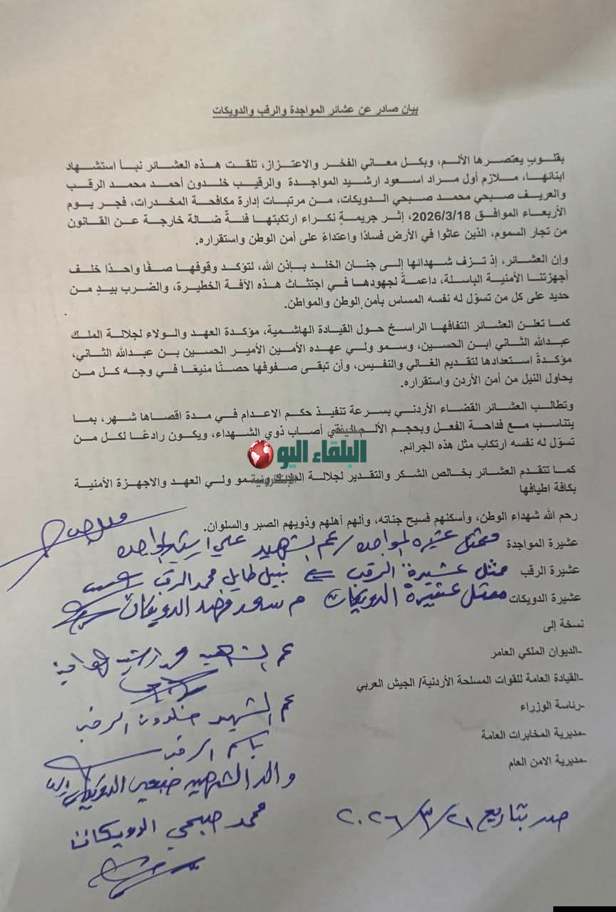 بیان صادر عن عشائر (#المواجدة والرقب والدويكات) يطالب القضاء الأردني بسرعة تنفيذ حكم الاعدام بمدة اقصاها شهر، للمجرم ..