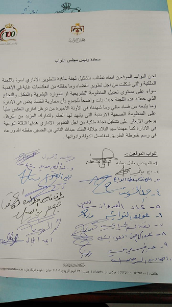 نحن النواب الموقعين ادناه نطالب بتشكيل لجنة ملكية للتطوير الاداري اسوة باللجنة الملكية والتي شكلت من اجل تطوير القضاء وما حققته من انعكاسات غاية في الاهمية سواء على مستوى تعديل المنظومة التشريعية او الموارد البشرية والمكان والنجاح الذي حققته هذه اللجنة حيث بات واضحاً للجميع بأن محاربة الفساد يكمن في الادارة وما يتبعه من فساد مالي وما شهدناه في الأونة الاخيرة من ترهل اداري انعكس سبباً على المنظومة الصحية الاردنية التي يشهد لها العالم ولتدارك المزيد من الترهل يرجى الايعاز على تشكيل لجنة ملكية من اجل التطوير الاداري هدفها النقلة النوعية في الادارة كما عهدنا سيد البلاد جلالة الملك عبدالله الثاني بن الحسين حفظه الله ورعاه في رسم خارطة الطريق لمفاصل الدولة وادواتها .