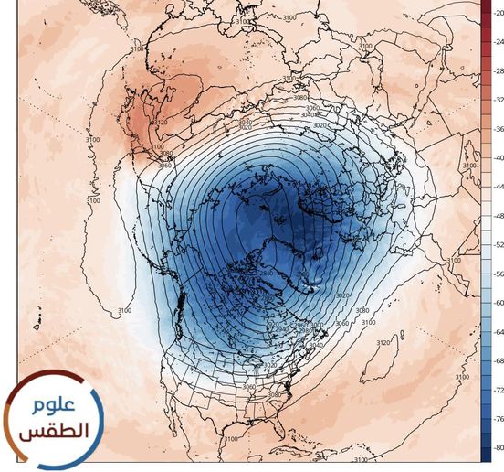تُظهر خارطة الغلاف الجوي عند طبقة الـ 10 مليبار انخفاضًا عميقًا في الحرارة مع سيطرة دوامة قطبية قوية ومتماسكة فوق القطب الشمالي. يشير هذا النمط إلى استقرار النظام القطبي وضعفٍ واضح في احتمالية انهيارٍ سريع أو انتقال للكتل الباردة إلى العروض الدنيا. يعكس ذلك سيطرة ضغط منخفض قوي في الطبقة العليا، ما يدعم تعزيز النشاط الشتوي في مناطق العروض الوسطى.