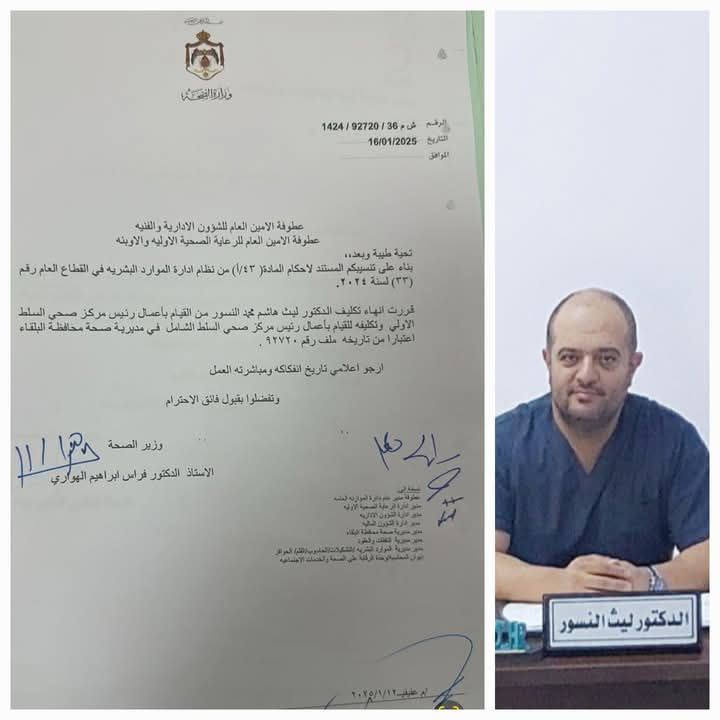 قرر وزير الصحة تكليف #الدكتور #ليث #هاشم #محمد #النسور