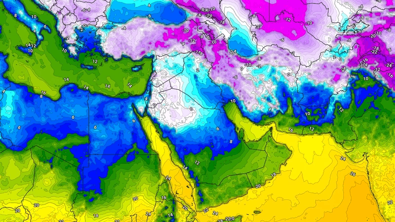 تبين آخر محاكاة الخرائط الجوية للغلاف الجوي توضع كتلة هوائية شديدة البرودة نحو دول شرق المتوسط خلال الأيام القادمة مرفقة بطقس شديد البرودة ودرجات حرارة متدنية للغاية في ساعات الليل في العديد من الدول.