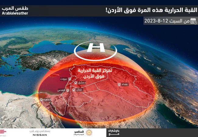 - تشير الخرائط المختصة بحركة الأنظمة الجوية إلى تأثر عدة دول عربية بينها الأردن خلال الأيام القادمة بما يسمى بظاهرة القبة الحرارية، وما يرافقها من درجات حرارة مرتفعة للغاية وأجواء صيفية حارة إلى شديدة الحرارة.