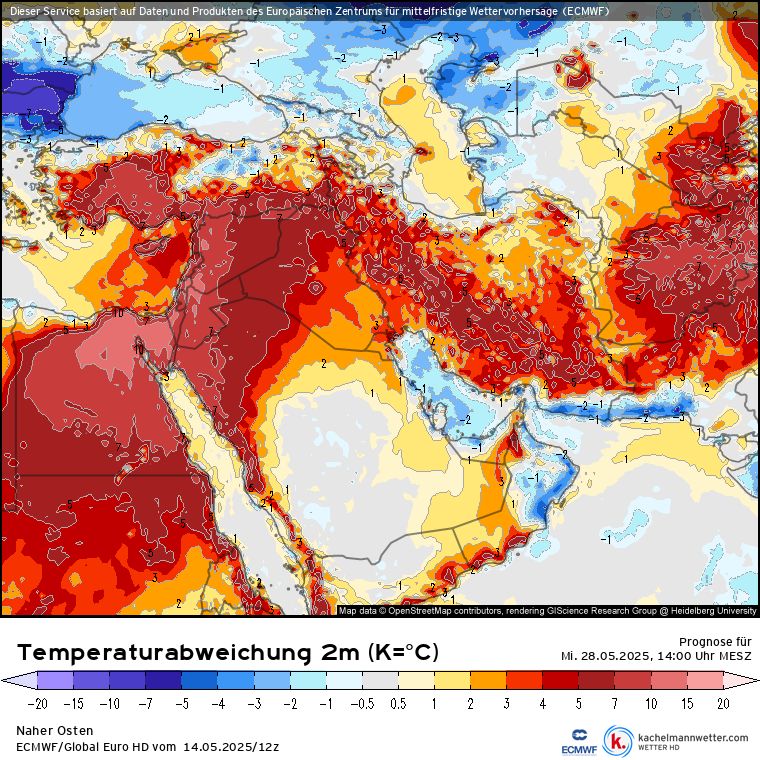 يتوقع حسب التحديثات الحالية أن تصل درجات الحرارة مابين منتصف إلى نهاية الأربعينات في مصر وقد تلامس 50 درجة ببعض مناطق غرب السعودية وتتراوح بين 37 إلى 40 درجة بأجزاء واسعة من بلاد الشام وتتجاوز 45 في البحر الميت.