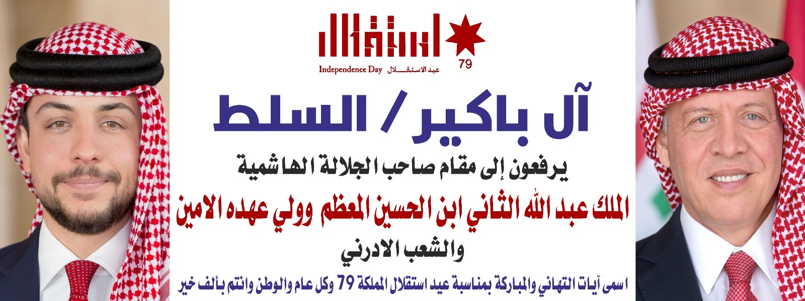 يتقدم #آل #باكـير في المملكة الأردنية الهاشمية عامة، ومدينة السلط خاصة، بأسمى آيات التهنئة والتبريك إلى مقام صاحب الجلالة الهاشمية الملك عبدالله الثاني ابن الحسين المعظم، وولي عهده الأمين سمو الأمير الحسين بن عبدالله الثاني، وإلى العائلة الهاشمية الكريمة، بمناسبة الذكرى التاسعة والسبعين لاستقلال المملكة الأردنية الهاشمية.
