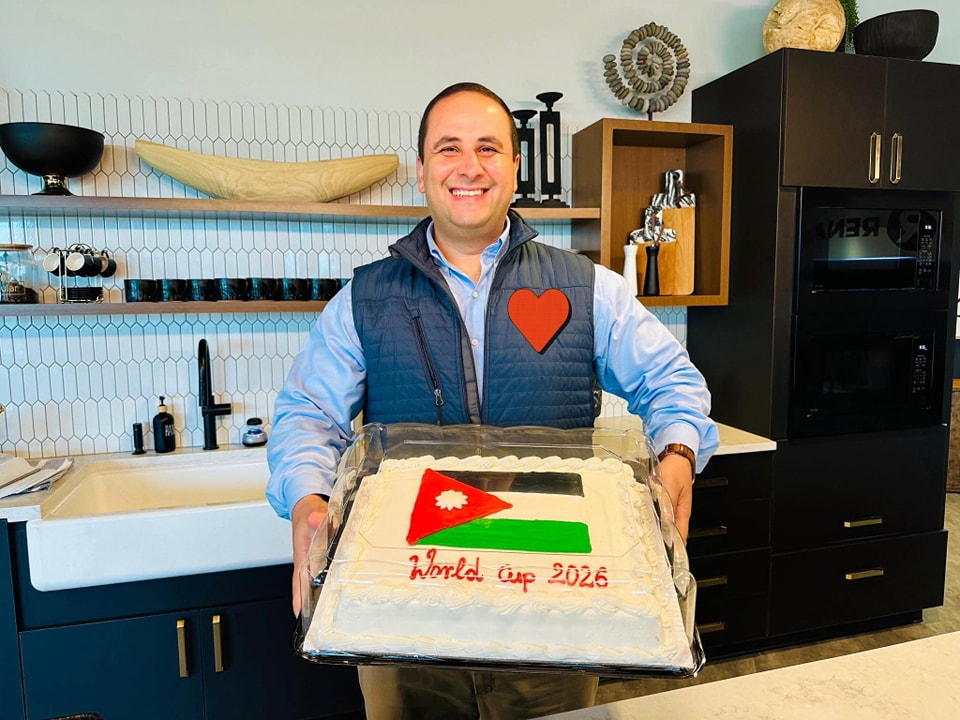 يقوم بتوزع الكيك في موقع عمله بمناسبة تأهل النشامى لكأس العالم، وتقديم بريزنتيشن عن الأردن