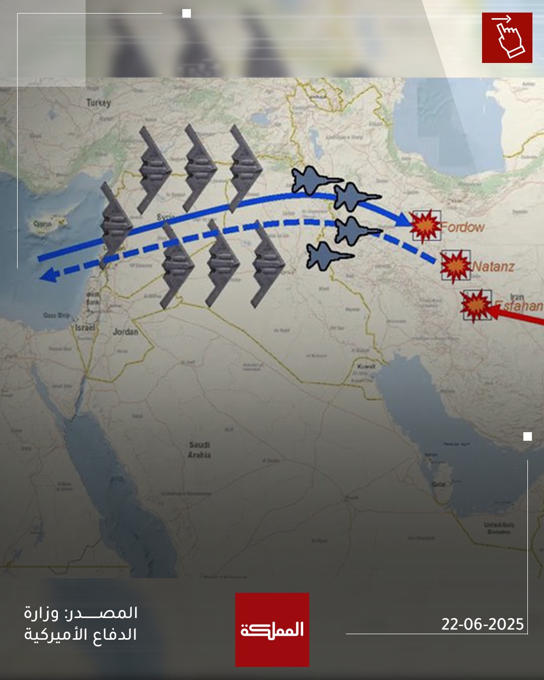 قائد الجيش الأميركي يعرض خارطة لمسار قاذفات B2 التي استهدفت منشأت نووية إيرانية تظهر أنها مرت فوق البحر المتوسط ثم لبنان وسوريا والعراق قبل أن تصل أهدافها في إيران