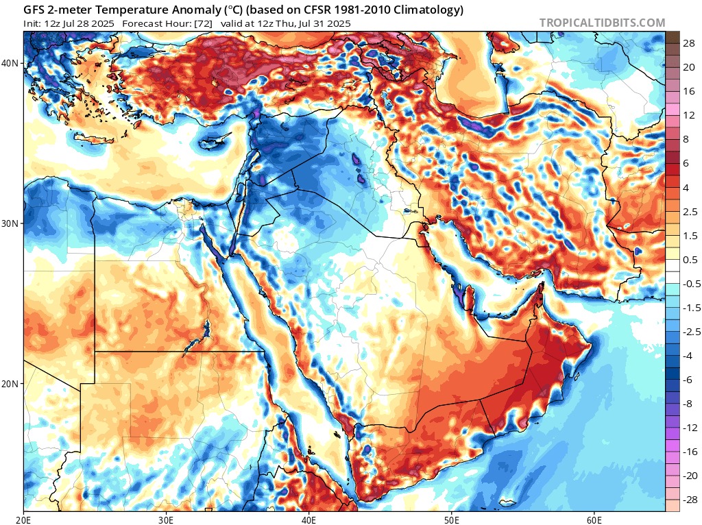 ومن المرتقب أن تؤدي هذه الكتلة الهوائية إلى انخفاض كبير وملحوظ في درجات الحرارة، خاصة مع نهاية الأسبوع، وذلك في بلاد الشام وشمال مصر وأجزاء من العراق وشمال السعودية، نتيجة اندفاع الرياح الحارة جنوباً بعيداً عن المنطقة بفعل تأثير هذه الكتلة المعتدلة.