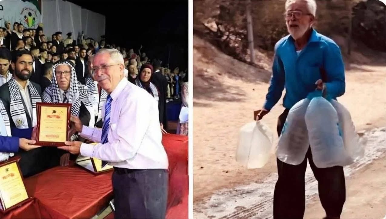 الأولى التُقطت له قبل الإبادة حيث كان يكرم ويتبرع ، والثانية بعد توقفه إثر إرهاق شديد أثناء محاولته جلب كمية بسيطة من المياه في أحد مخيمات النزوح بغزة.