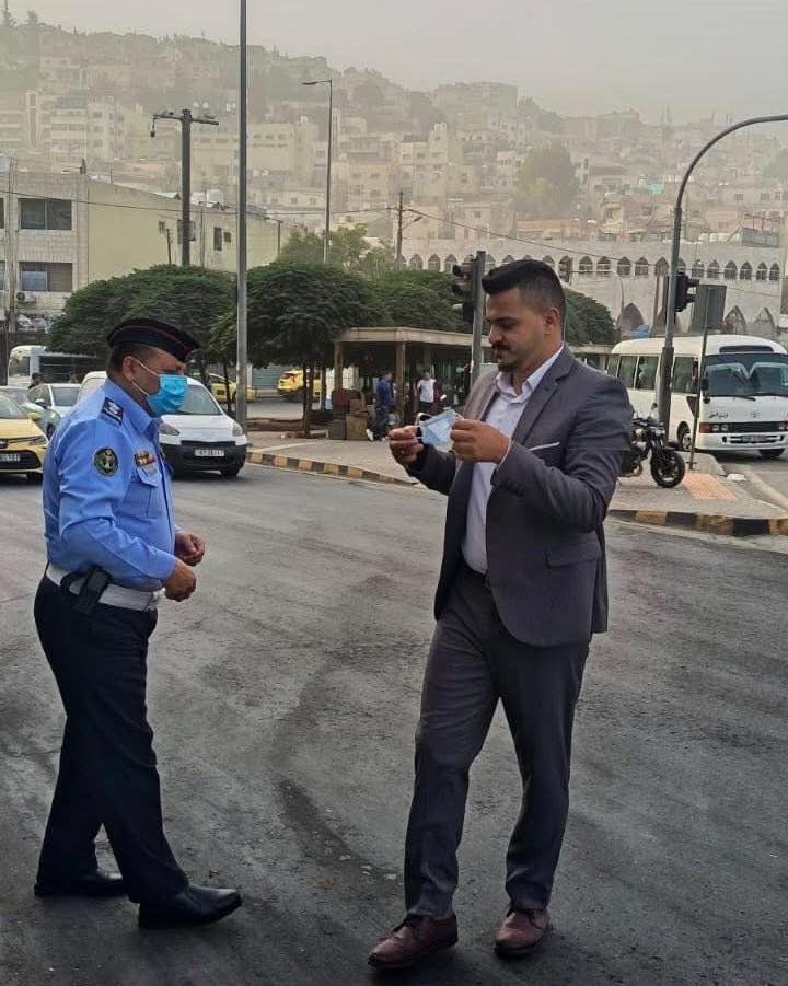 البلقاء اليوم - وزع نشامى ادارة السير في الميدان صباح اليوم الكمامات على عدد من السائقبن ومستخدمي الطريق