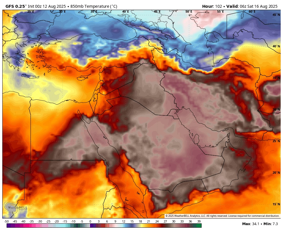 يوم غد الاربعاء سيكون ذروة تأثير الموجة الحارة على المنطقة، ولا مؤشرات حتى الان على موجات حارة جديدة خلال الاسبوعين المقبلين.