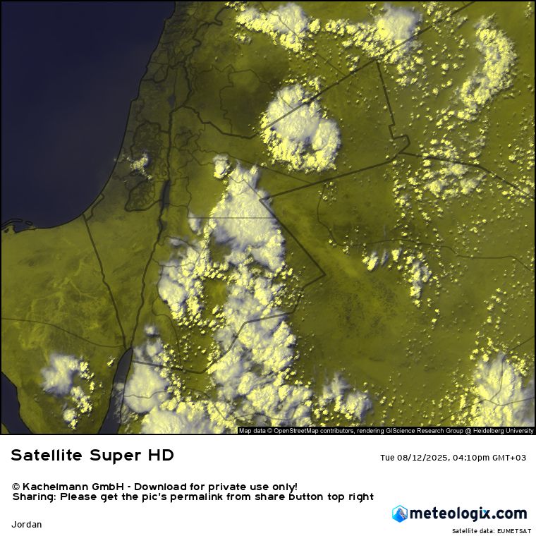 البلقاء اليوم - - صور الأقمار الاصطناعية ترصد بمشهد نادر ولليوم الثالث على التوالي تشكل سحب رعدية قويه على مناطق واسعه من جنوب المملكة خصوصاً محافظة #معان واجزاء من المنطقه #الشرقيه #وشرق_الصفاوي ، وصولاً إلى المنطقه #البادية_الوسطى هذه السحب تعمل حالياً في المناطق المذكورة على تساقط امطار غزيره مصحوبه بالعواصف الرعدية وتساقط البرد وتعمل على تشكل السيول في الأودية والشعاب نتيجة غزارة الأمطار..