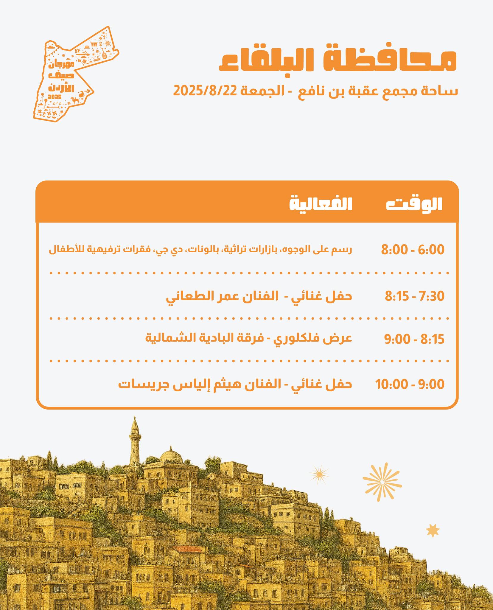 ستقام الفعاليات في #عمان، و #البلقاء، و #الزرقاء، و #إربد، و #جرش، و #عجلون، و #المفرق، والدخول مجاني لجميع المواقع والفعاليات.