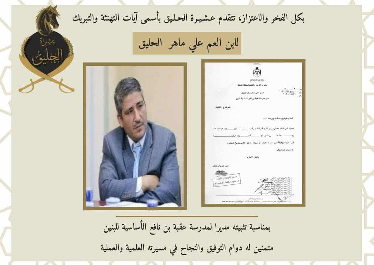 بمناسبة صدور قرار تثبيته مديراً لمدرسة عقبة بن نافع الأساسية للبنين