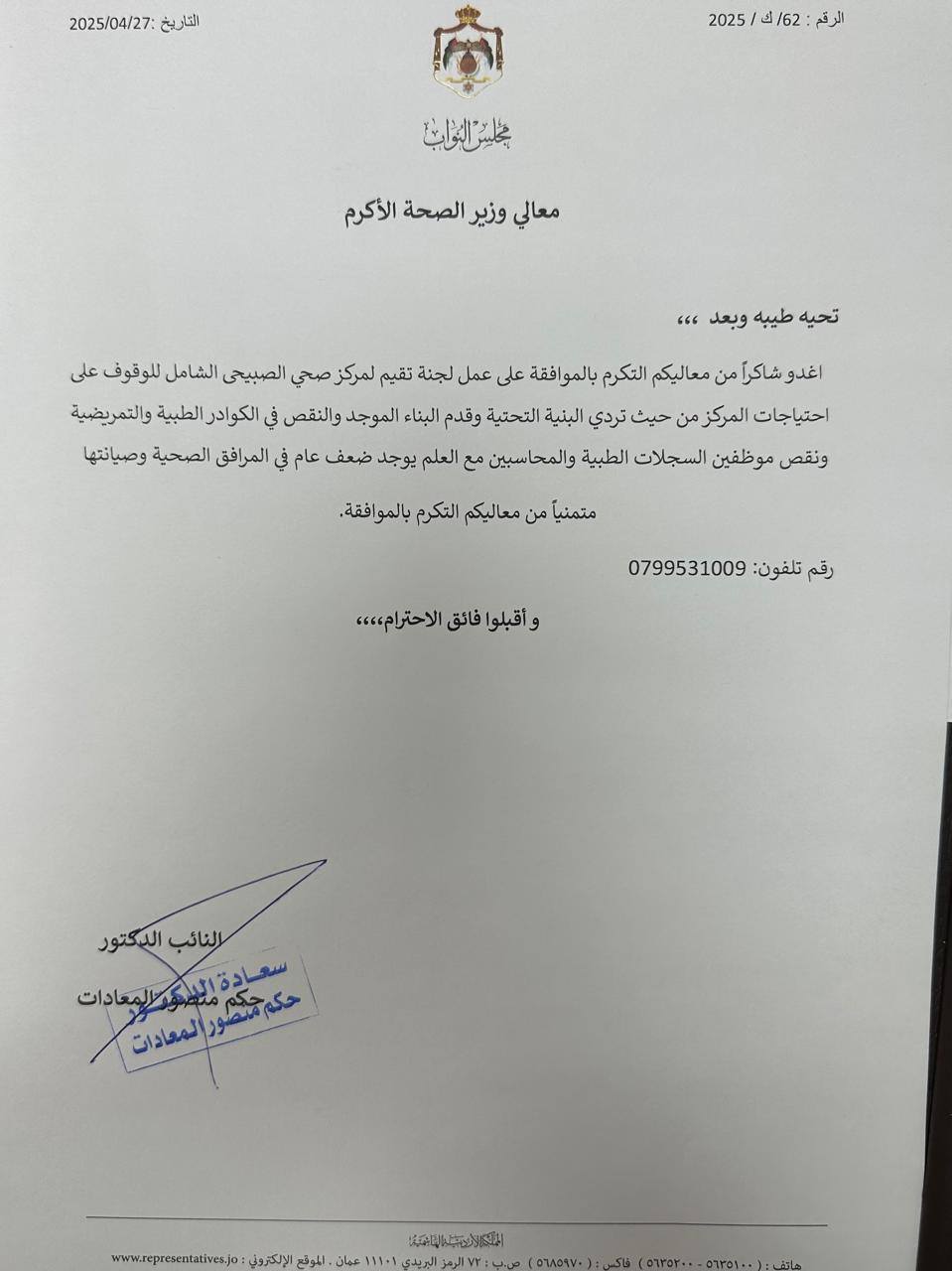 البلقاء اليوم - "أعلنت وزاره الصحه عن طرح عطاء رقم (ص/ 51/2025) الخاص بأعمال صيانة عامة لمركز صحي الصبيحي الشامل/ قصبه السلط ، وذلك في إطار جهود تطوير وتحديث المراكز الصحية في المنطقة. ويأتي هذا الإعلان في ظل المتابعة المستمرة من سعادة الدكتور حكم المعادات، الذي يولي أهمية كبيرة لتقديم خدمات صحية متميزة للمواطنين.