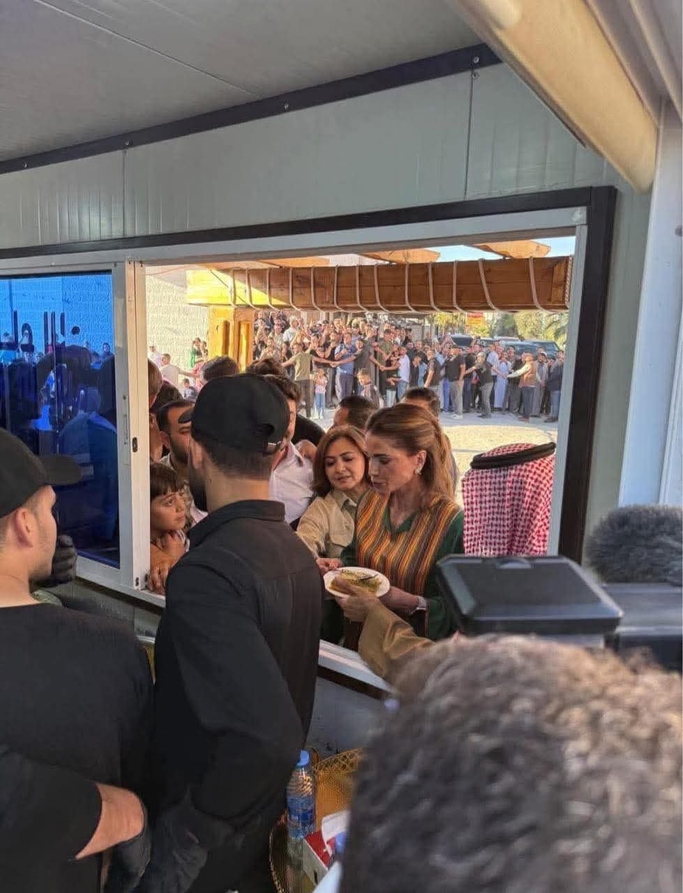 جلالة الملكة رانيا العبدالله اليوم بالثوب الهرمزي المعاني من امام كوخ الهريسة المعانية من مدينة معان .