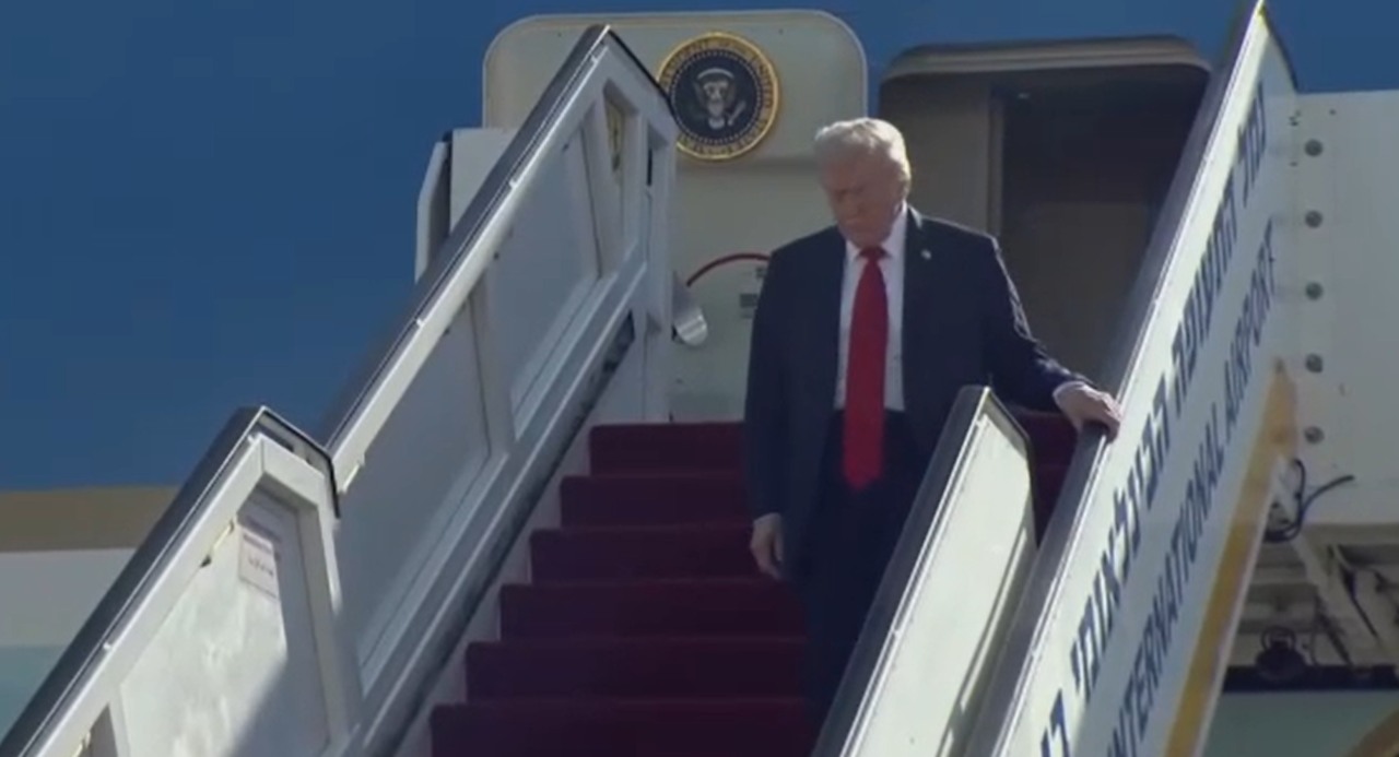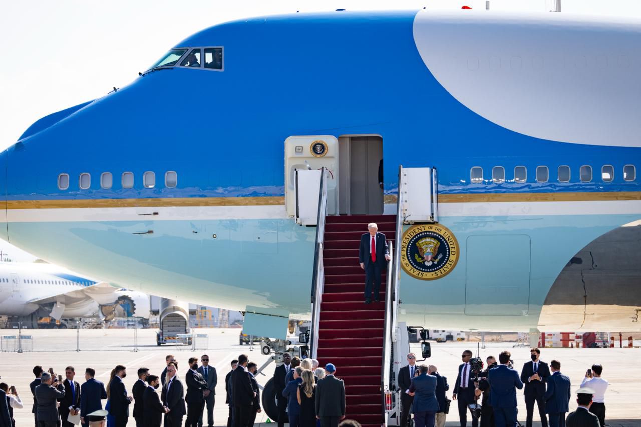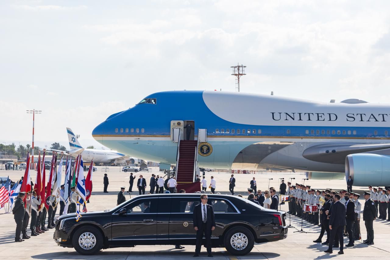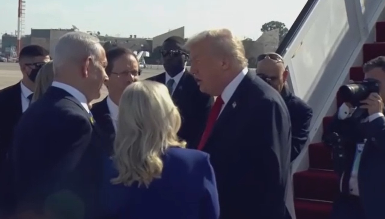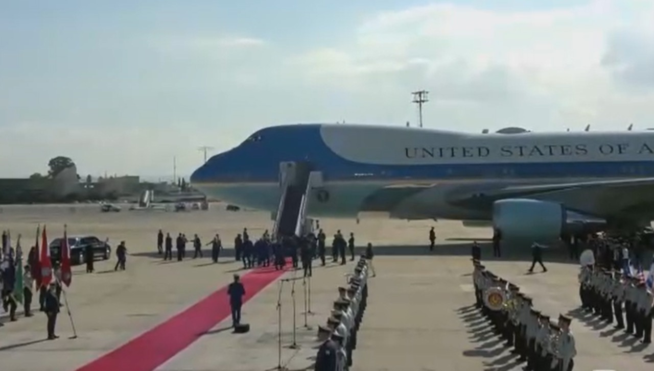 البلقاء اليوم - لحظة هبوط طائرة الرئيس الأميركي دونالد ترمب في مطار تل أبيب، وذلك في إطار زيارته إلى المنطقة، حيث من المقرر أن يلتقي بالأسرى الإسرائيليين ويُلقي كلمة أمام الكنيست تتناول مسار السلام وخطته لتثبيت وقف إطلاق النار.