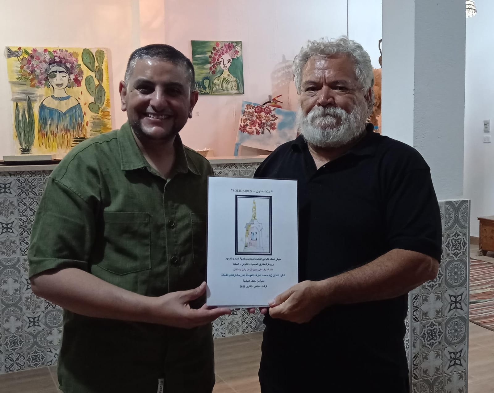 وفي حفل بهيج حظي العواملة بتكريم خاص من الداعم والراعي الرسمي للملتقى الدكتور عبدالحميد الفهري مدير ومالك متحف العباسية في جزيرة قرقنة التونسية تقديرًا لإبداعه الفني المتميز وإسهامه البارز في إنجاح فعاليات الملتقى من خلال لوحاته التي زينت "برج غزة".