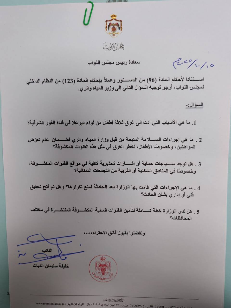 وجه سعادة النائب خليفة الديات سؤالًا نيابيًا إلى وزير المياه والري، تمهيدًا لاستجوابه، على خلفية حادثة غرق ثلاثة أطفال في قناة الغرب بمحافظة البلقاء، والتي أثارت حزنًا واسعًا في الشارع الأردني.