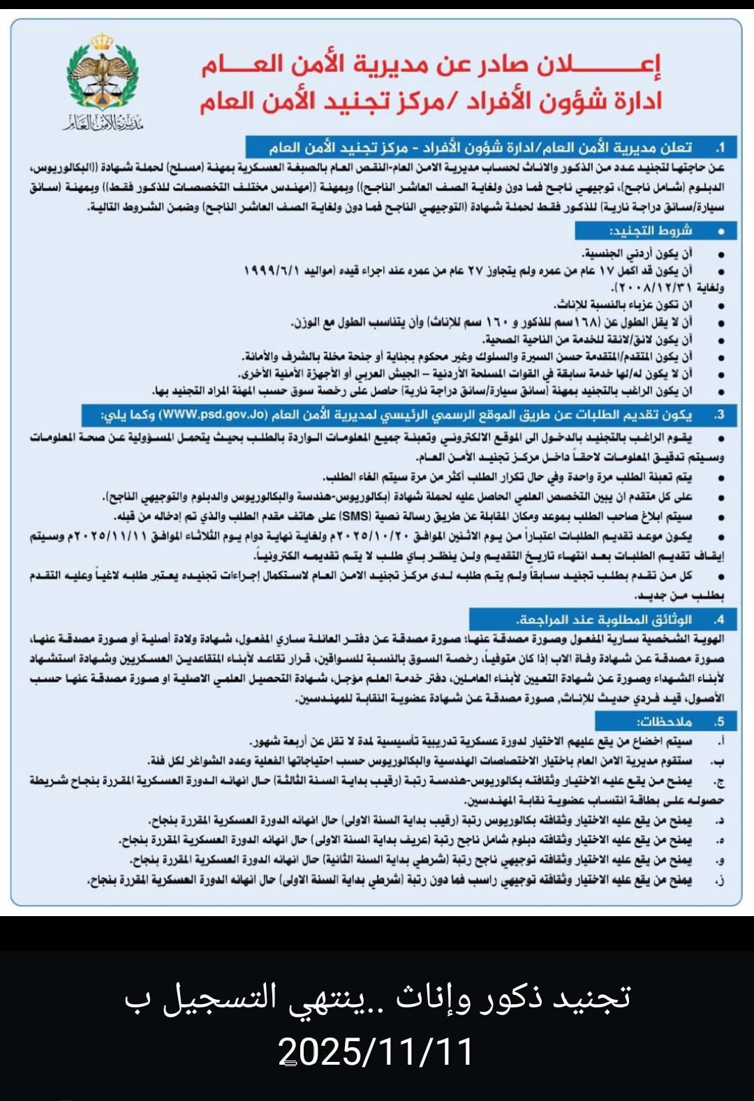 البلقاء اليوم - أعلنت مديرية الأمن العام / إدارة شؤون الأفراد - مركز تجنيد الأمن العام- عن حاجتها لتجنيد عدد من الذكور والاناث لحساب مديرية الامن العام- النقص العام بالصبغة العسكرية بمهنة (مسلح) لحملة شهادة ((البكالوريوس، الدبلوم (شامل ناجح)، توجيهي ناجح فما دون ولغاية الصف العاشر الناجح)) وبمهنة ((مهندس مختلف التخصصات للذكور فقط)) وبمهنة (سائق سيارة/سائق دراجة نارية) للذكور فقط لحملة شهادة (التوجيهي الناجح فما دون ولغاية الصف العاشر الناجح).