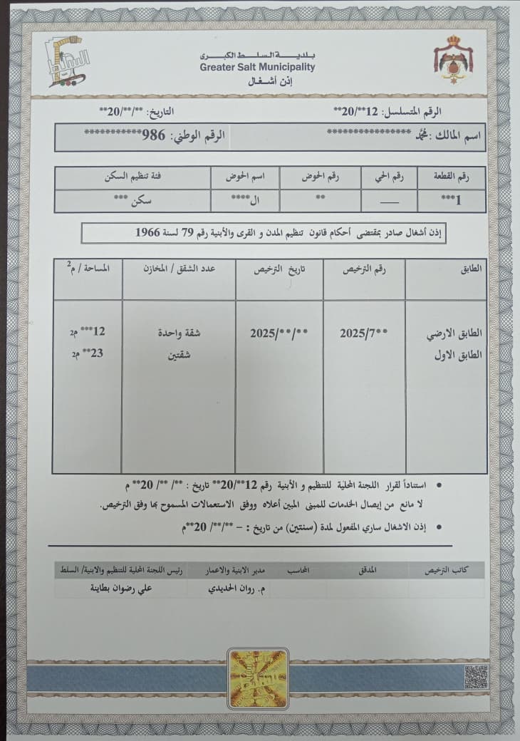 في خطوة ريادية غير مسبوقة على مستوى بلديات المملكة أعلنت بلدية السلط الكبرى عن إطلاقها الجديد لإصدار وثائق رسمية أمنية عالية الجودة تتصدرها وثيقة "إذن الأشغال" وذلك بهدف حماية الوثائق الرسمية وحقوق المواطنين.