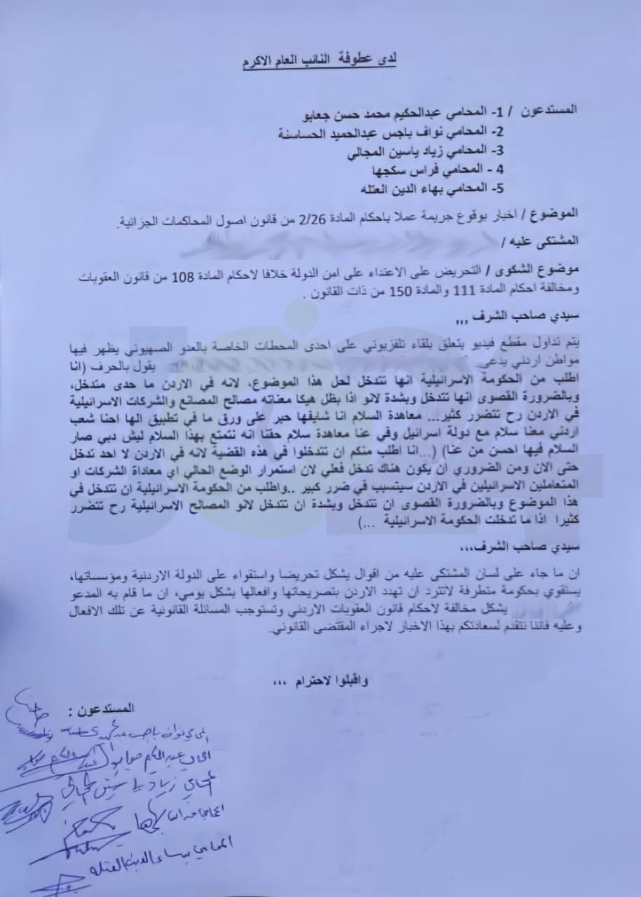 البلقاء اليوم - - تقدم عدد من المحامين بإخبار لدى النائب العام بحقّ مواطن / محامٍ سابق، وذلك إثر ظهوره على إحدى القنوات العبرية، طالبا تدخّل حكومة الاحتلال الصهيوني في شأن أردني خاصّ.