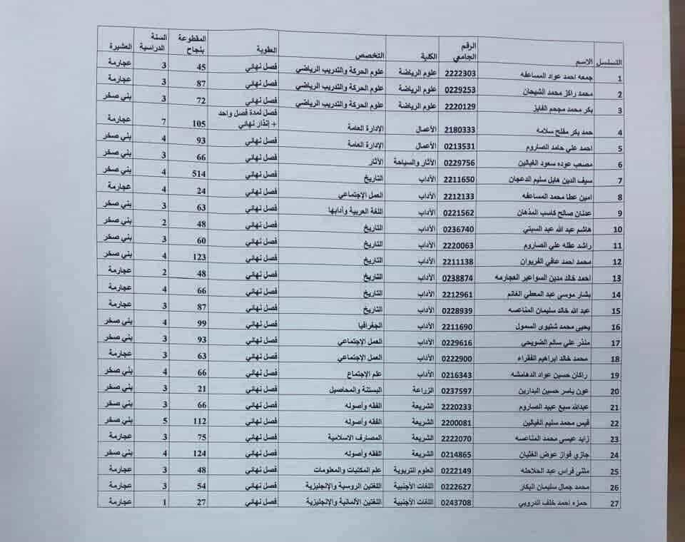 البلقاء اليوم - صورة توضح بالأسماء من هم الشباب المفصولين فصل نهائي في مشاجرة الجامعة الاردنية، 3 منهم خريجين هذا الفصل.