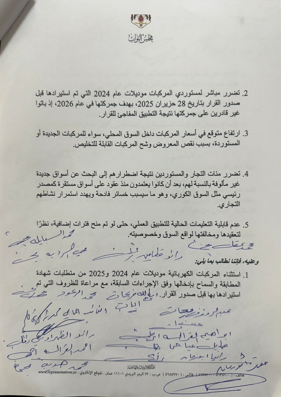 وأشار النواب إلى أن القرار ألحق ضررا مباشرا بمستوردي مركبات موديل 2024 الذين استوردوا سياراتهم قبل صدوره في 28 حزيران 2025 بهدف جمركتها في عام 2026 مؤكدين أن التطبيق المفاجئ أدى إلى شلل شبه تام في حركة البيع والتخليص داخل السوق وخلق حالة من الارتباك لدى المستثمرين.