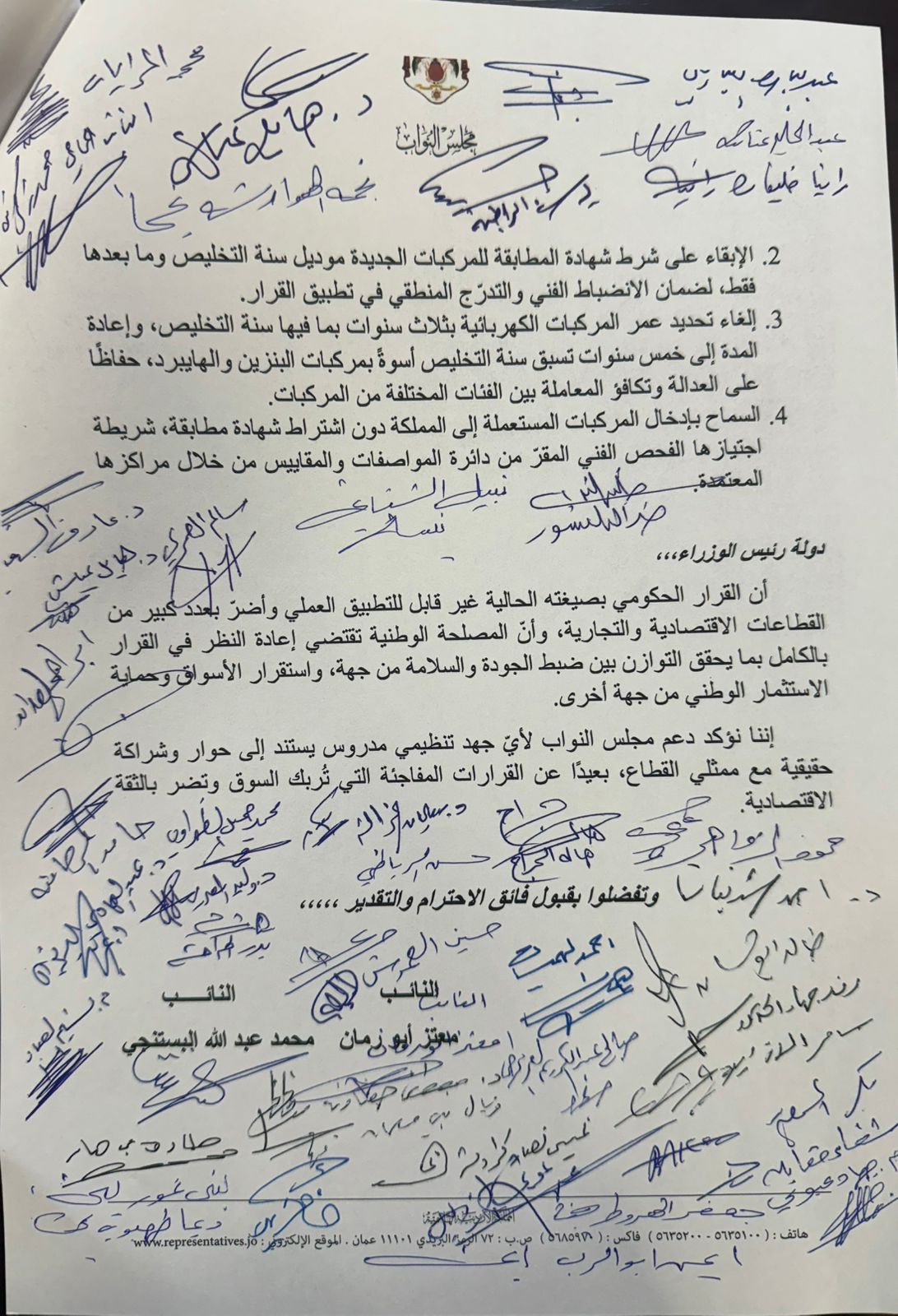تبنى النواب محمد البستنجي رئيس هيئة مستثمري المناطق الحرة ومعتز أبو رمان رئيس لجنة العمل والتنمية الاجتماعية والسكان النيابية في الدورة الأولى وأيمن البدادوة رئيس لجنة الخدمات والنقل النيابية مذكرة نيابية موجهة إلى رئيس الوزراء الدكتور جعفر حسان وقع عليها أكثر من 80 نائبا طالبوا فيها بإعادة النظر في القرار الحكومي المتعلق بمنع إدخال المركبات غير الحاصلة على شهادة مطابقة لما ترتب عليه من آثار سلبية على قطاع تجارة المركبات في المملكة وخاصة في المنطقة الحرة بالزرقاء.