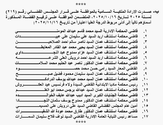 البلقاء اليوم - صدرت الإرادة الملكية السامية، بالموافقة على قرارا المجلس القضائي المتضمن الموافقة على ترفيع القضاة المذكورة أسماؤهم تاليا: