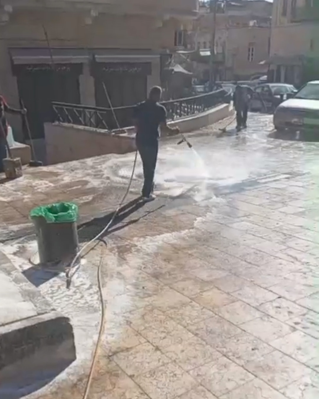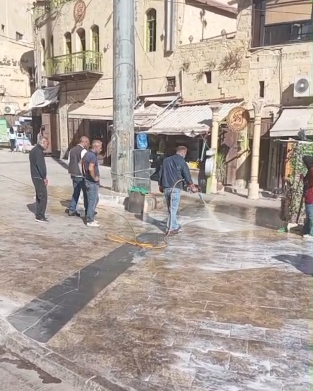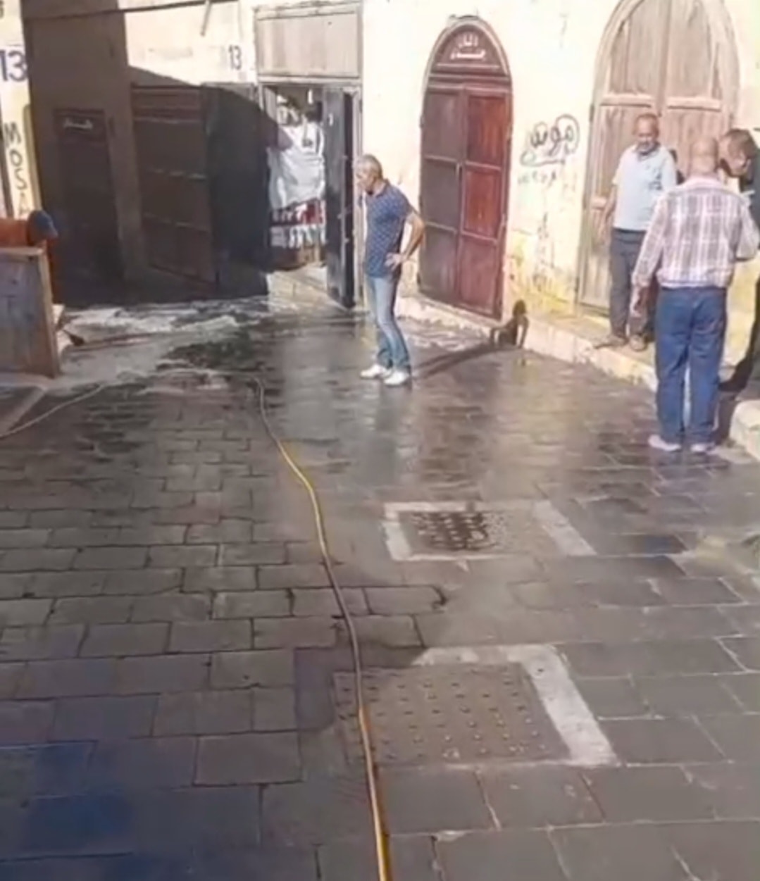 بأعمال تنظيف وشطف شاملة في وسط المدينة التراثي خصوصا في شارع الخضر وساحة العين.