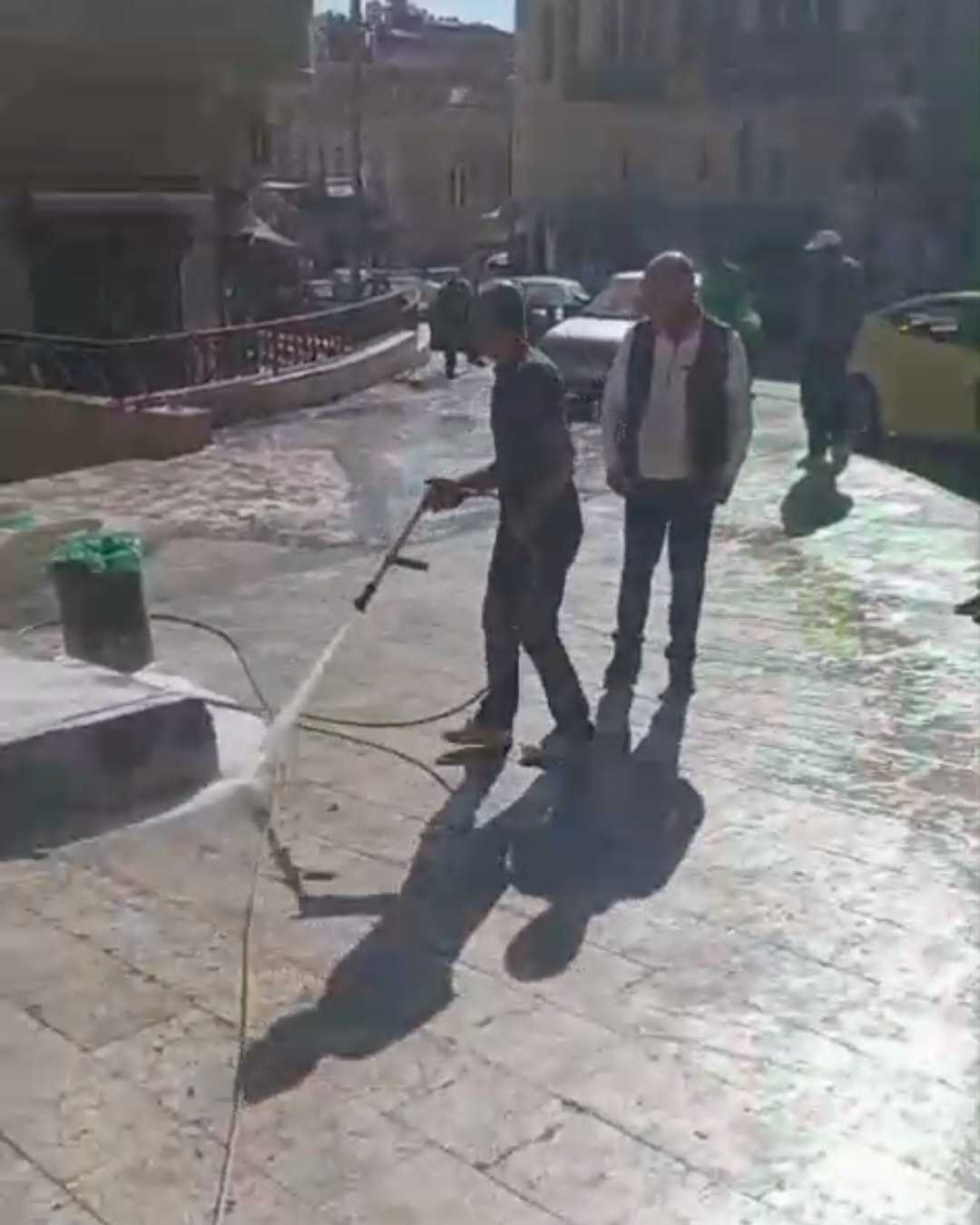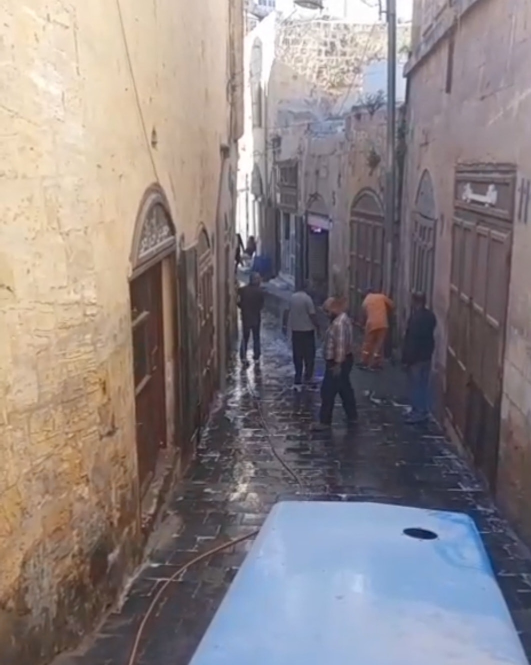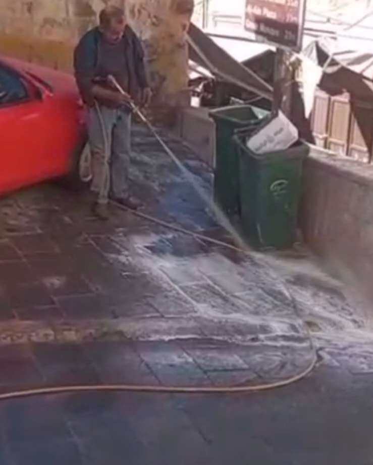 بأعمال تنظيف وشطف شاملة في وسط المدينة التراثي خصوصا في شارع الخضر وساحة العين.
