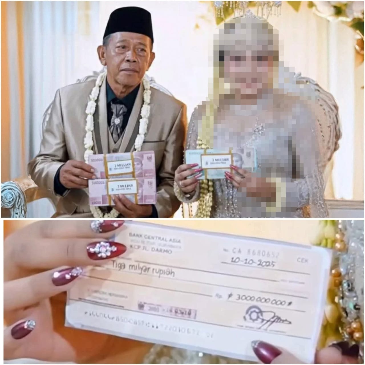 البلقاء اليوم - هذا العريس من إندونيسيا عمره 74 سنة قدم مهر قدره 120 ألف دولار للزواج من فتاة عمرها 24 سنة و أقام حفل زفاف صاخب ووزع على الضيوف 6000 دولار أخرى