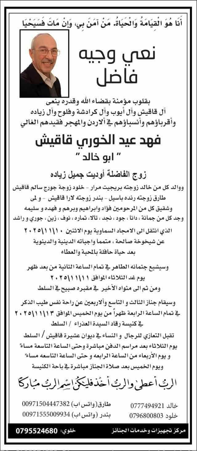 البلقاء اليوم - فهد عيد الخوري قاقيش في ذمة الله