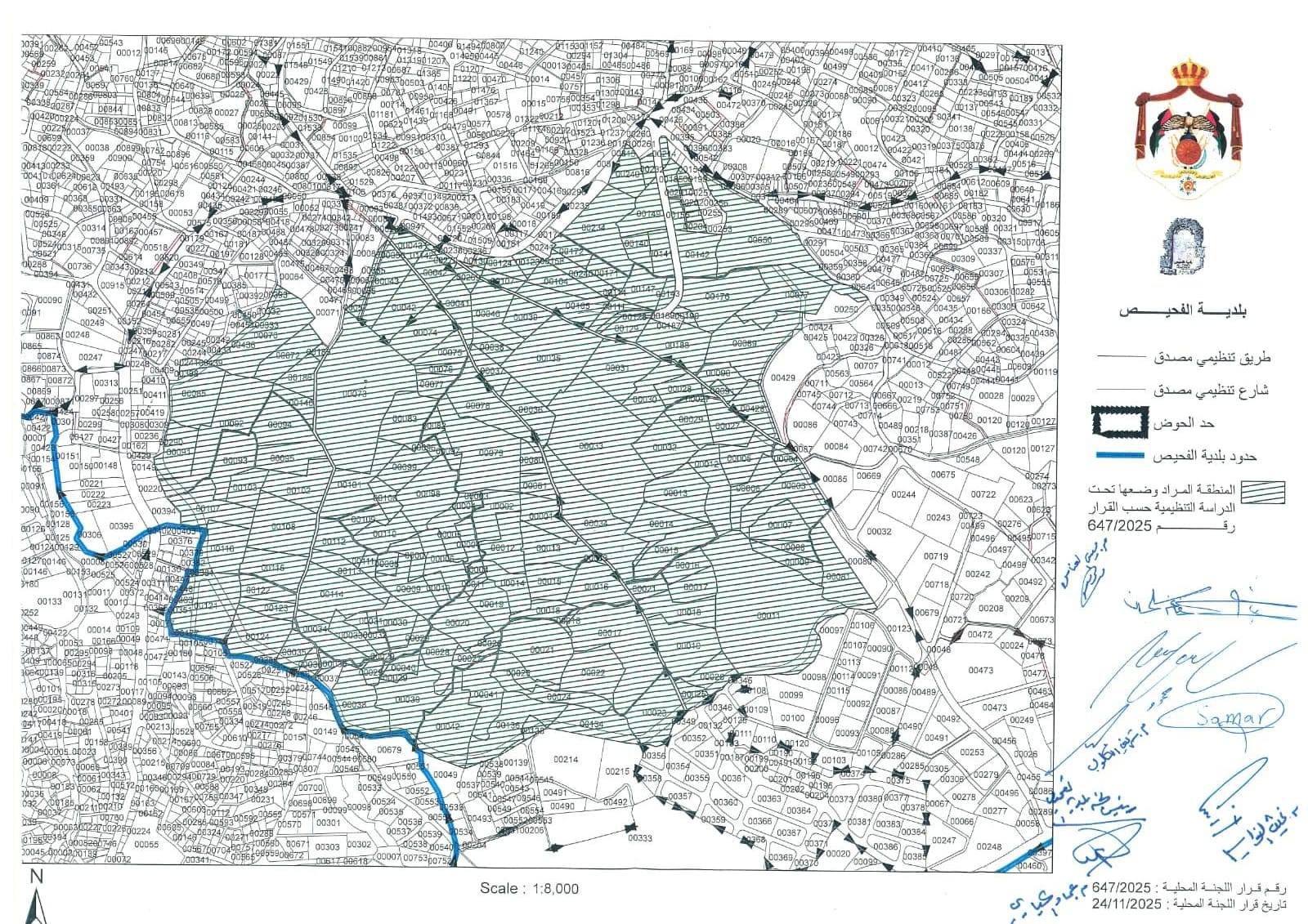 اولاً: اعتبار المنطقة الو اقعه ضمن الاحواض) 11 الرهوة ، 17 الدير ، 18 ام العرايس ، 19 عبية( و المشار اليها بالمخطط المرفق للقرار و الذي يعتبر جزء لا يتجزء من القرار منطقة تنظيم و اخضاعها للرقابة المؤقته لحين الانتهاء من اعداد مخطط تنظيمي لكافة الاراض ي الواقعه ضمن حدود بلدية الفحيص و المشار إليها في المخطط المرفق .