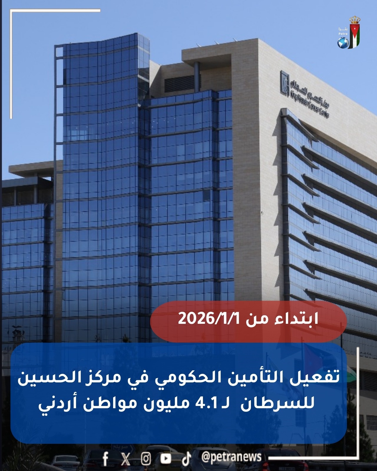 ويشمل التأمين الحكومي نحو 4.1 مليون مواطن أردني بتكلفة 124 مليون دينار خصصتها الحكومة من موازنة 2026، فيما تتحمل مؤسسة الحسين للسرطان بقية التكلفة البالغة نحو 8.5 مليون دينار.