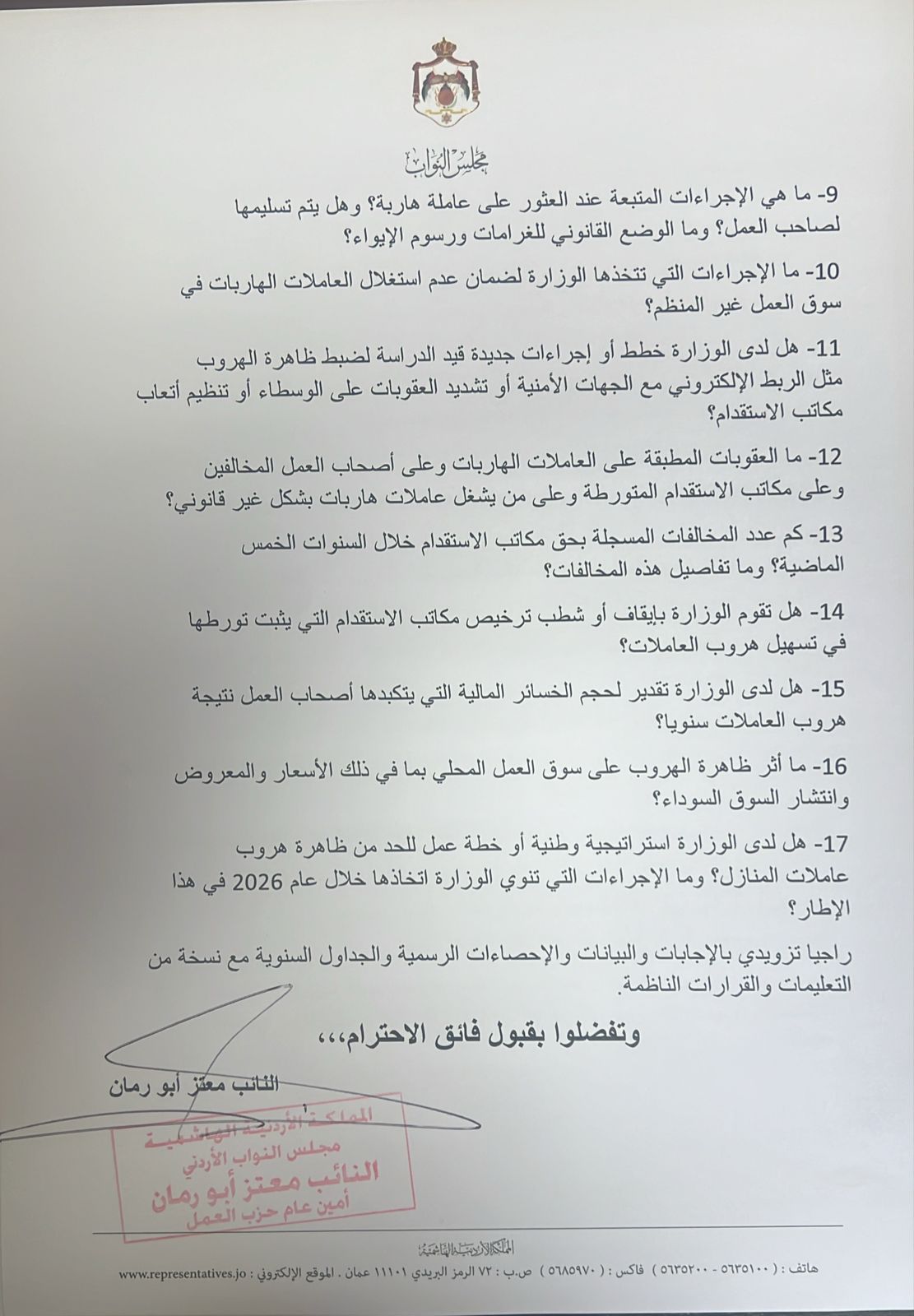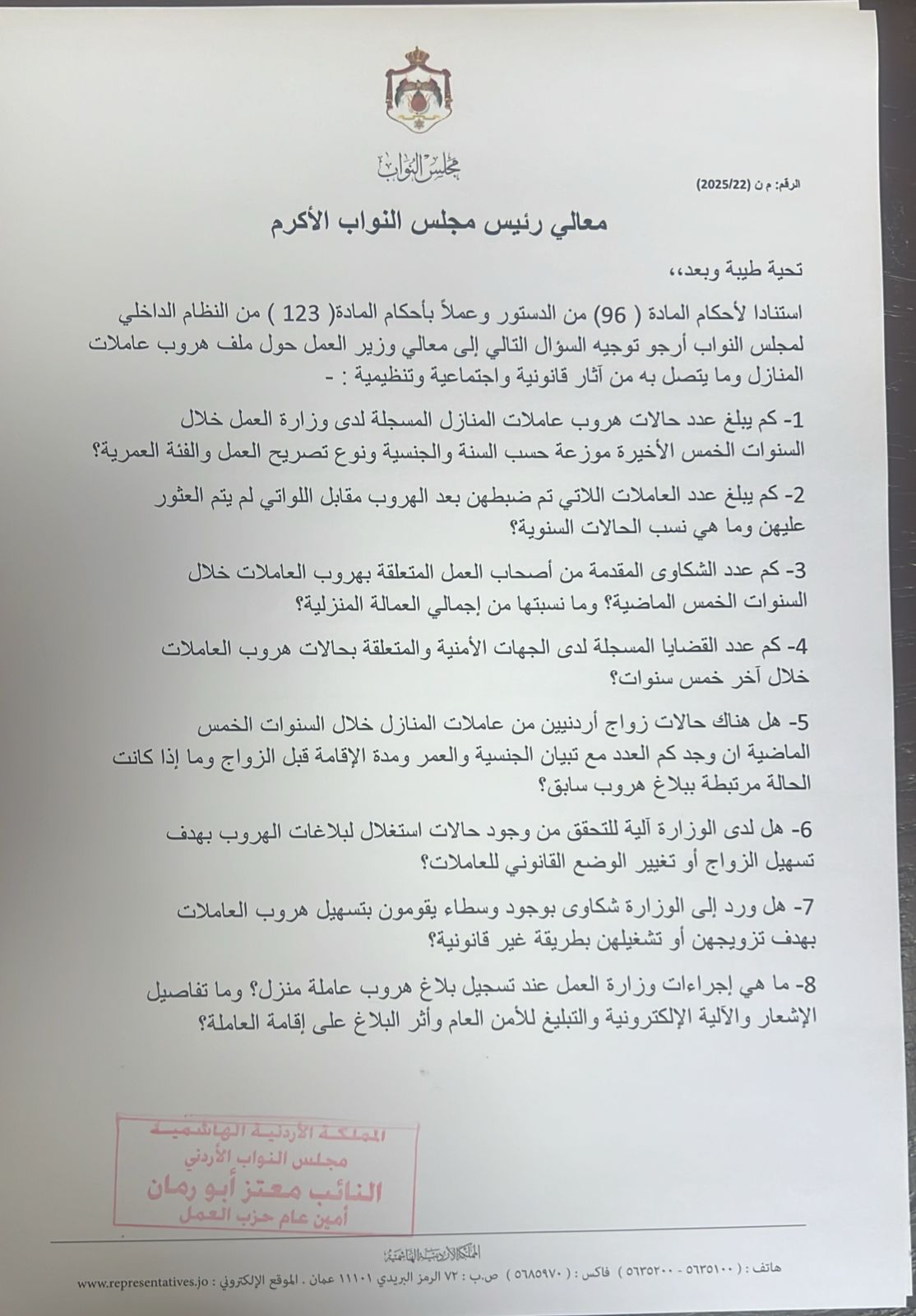 النائب أبو رمان يوجه سؤال نيابي إلى وزير العمل تضمن 17 بند حول ظاهرة هروب عاملات المنازل
