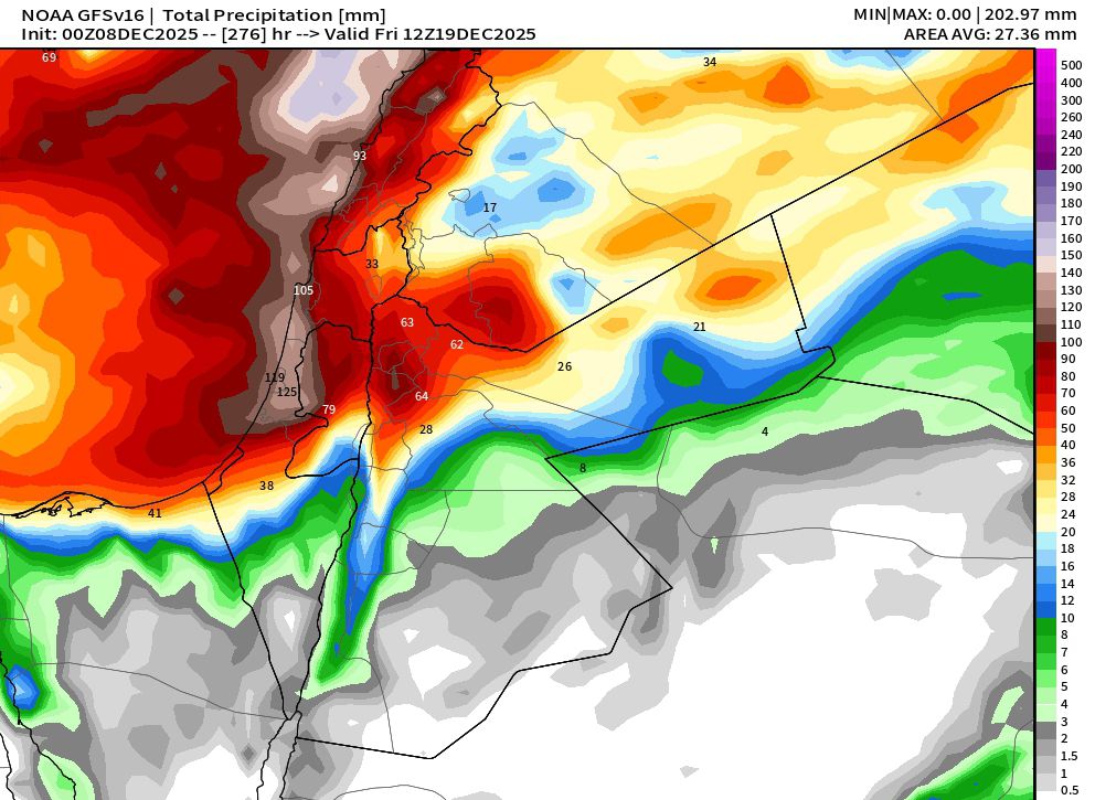 الخارطة المرفقة توضّح تراكم الهطول المطري المتوقع وفق مخرجات النموذج الأمريكي GFS، والذي يشير إلى نشاط لافت واتساع رقعة الهطولات بإذن الله.