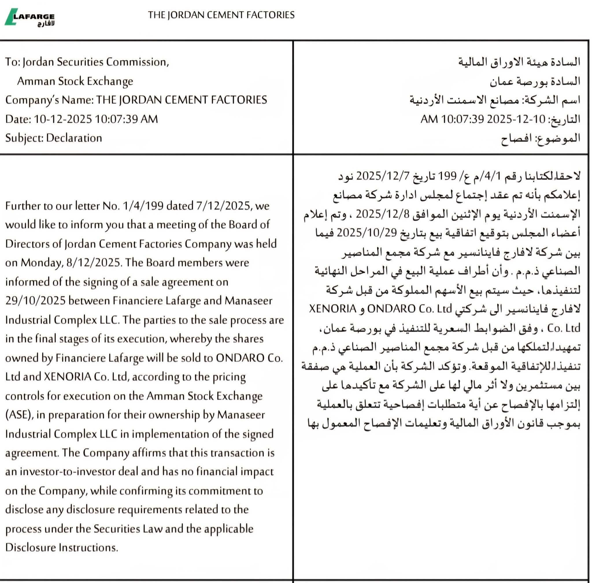 البلقاء اليوم - تم التوقيع على صفقة بيع أسهم لافارج 51% لصالح مجموعة المناصير ، لم يتبقى سوى اجراءات شكلية في البورصة وتصبح مجموعة المناصر هي المالك لشركة لافارج ، وبالتالي هي من يقرر مصير اراضي الاسمنت.