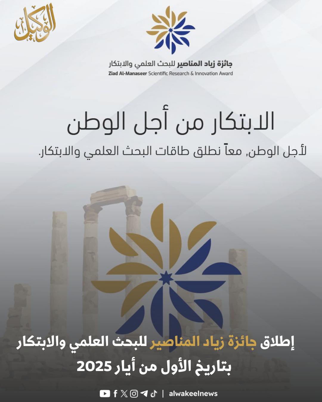 أُطلقت جائزة زياد المناصير للبحث العلمي والابتكار تحت مظلّة مؤسسة زياد المناصير الخيرية، لتكون منصة وطنية مخصّصة لتكريم الباحثين الأردنيين المبدعين ودعم ابتكاراتهم. وتأتي هذه الجائزة في إطار الجهود الرامية إلى تعزيز دور البحث العلمي في إيجاد حلول تطبيقية للتحديات التي يواجهها المجتمع الأردني، بما ينسجم مع رؤية جلالة الملك عبدالله الثاني ابن الحسين في دعم الابتكار والتنمية الاقتصادية والاجتماعية المستدامة.