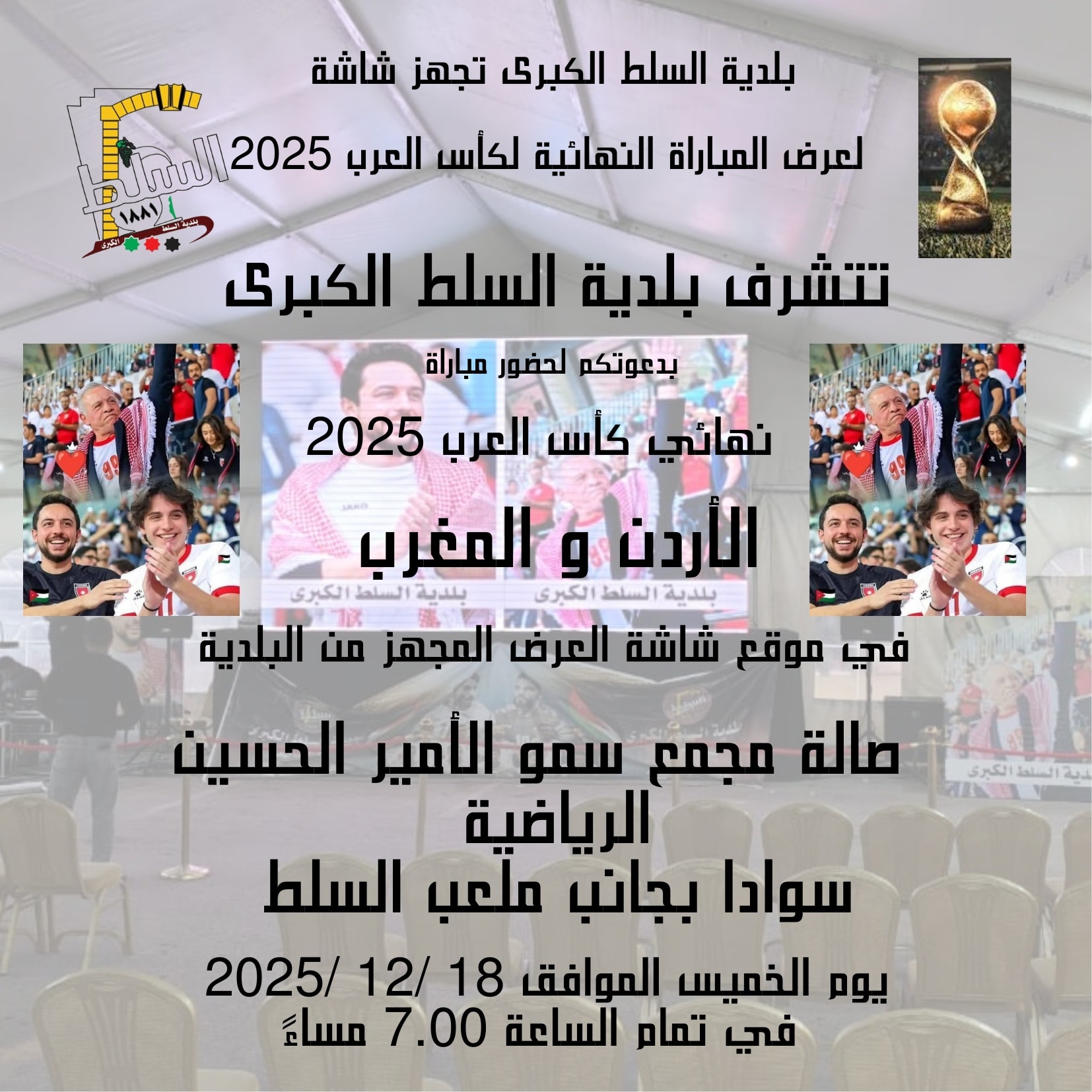 البلقاء اليوم - بلدية السلط الكبرى تجهز شاشة لعرض المباراة النهائية لكأس العرب 2025 الأردن و المغرب
